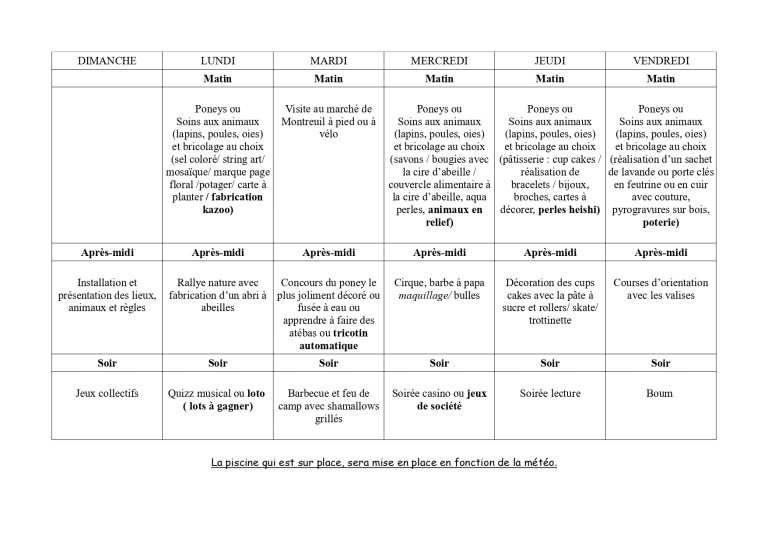 Ci-dessous un exemple de planning d'une semaine d'activités.